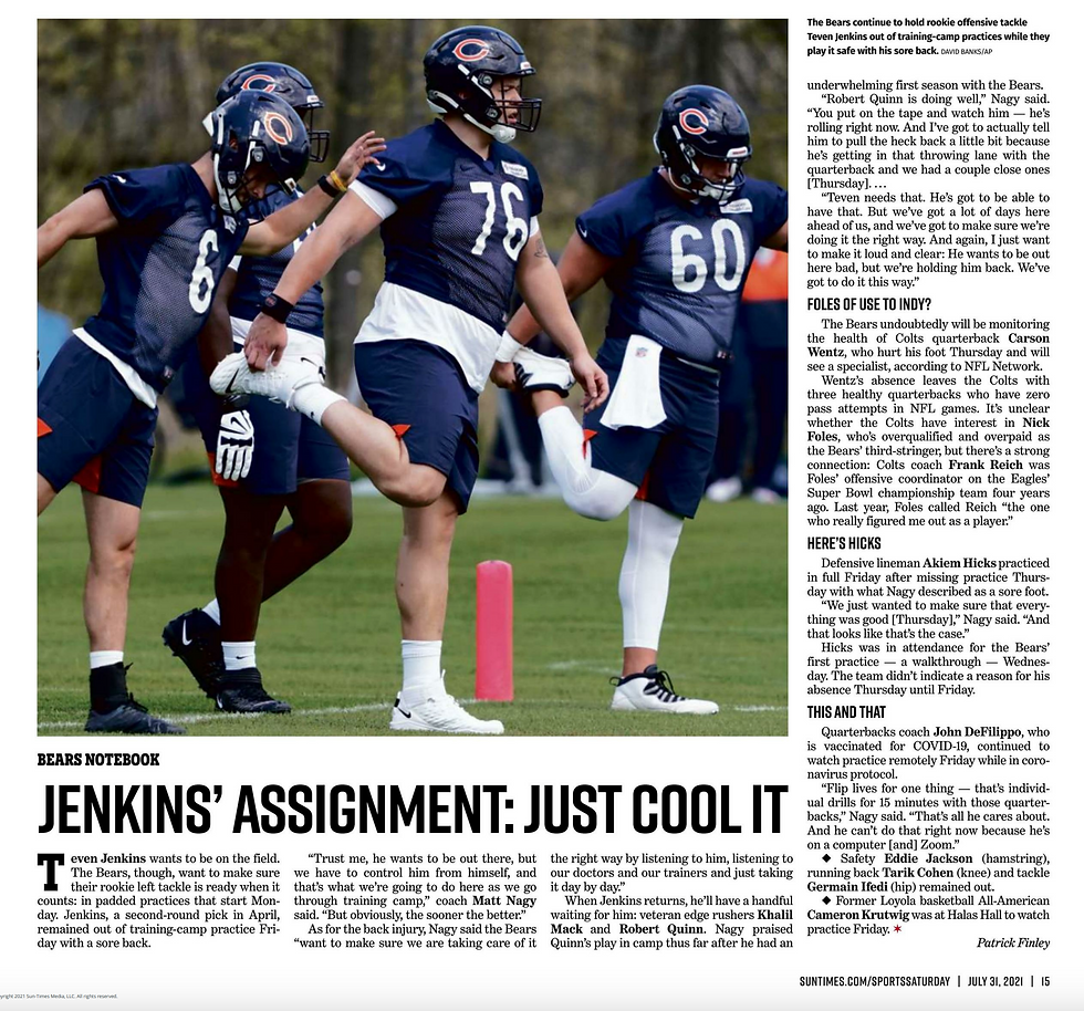 — Offensive tackle Teven Jenkins, the Bears’ second-round pick (No. 39) in 2021 who had back issues at Oklahoma State, was on the sidelines with what appeared to be a minor back issue when training camp started. Jenkins, pegged to be the starting left tackle as a rookie, had back surgery in mid-August and did not play until Week 13 of his rookie season.