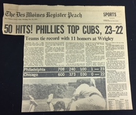 The Cubs' 23-22 loss to the Phillies on May 17, 1979 was front-page sports section news throughout the country — including the above-the-flag A1 coverage in the Idaho Statesman. (credit: University of Missouri School of Journalism library discard bin)